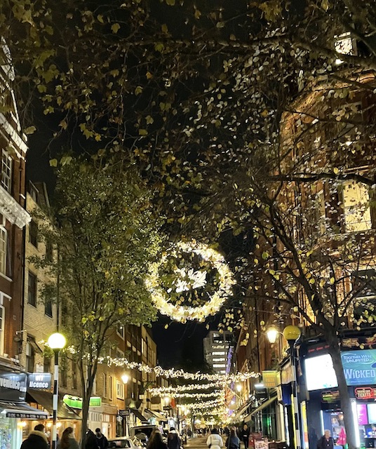 The Gielgud Theatre is a beautiful baroque style building, on Shaftesbury Avenue in the West End, and just a walk away from our hotel in Holburn. As we don’t get out much, the crowds on the street were a little overwhelming. But many of the Christmas lights were on, or maybe it’s this sparkly all year round, so we started to feel the spirit of a Friday night in London.
