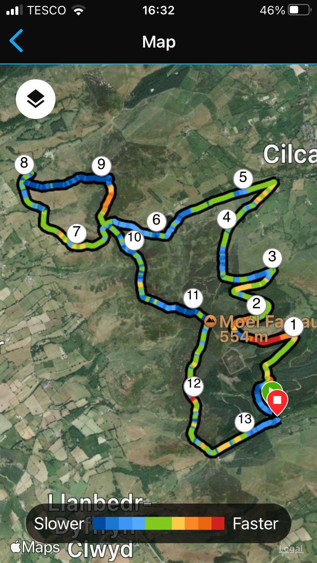I was planning to go around 13 miles this weekend anyway, in my (making it up as I go along) training plan so it seemed like a good idea. I knew it would be a bit hilly, but I hadn’t really looked at the route before I volunteered. The final hill was Moel Famau which is about 1820 ft high.