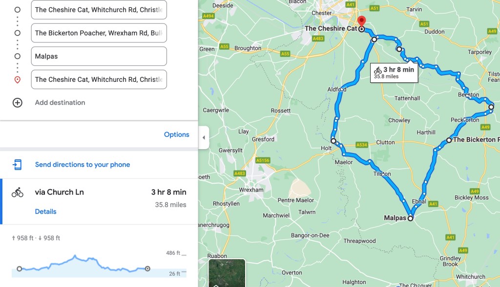 From the pub, the official route was a circular 35 miles to Malpas and back, but some of the group had cycled from home. The ride leader, Mark, a retired Paediatrician, had cycled all the way from Wallasey (I think?) which would have added another 20+ miles on each way! And another guy who introduced himself, Ali, did a whopping 94 in total. That would have been seriously intimidating but luckily a lot of the group had put their bikes in the car and driven over. My route along the tow path added another 3 to the base total, so that was a little extra.