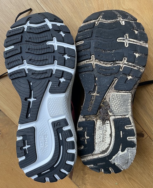 Most running shoe advice I’ve read suggests that they should be retired at around 300-500 miles but I don’t normally pay attention to that because I feel obliged to wring every last drop out of them as the carbon emissions involved in their creation is pretty high. Historically I’ve tended to buy a new pair of shoes each year at about the time when I’m starting to feel one or two little niggles in my lower legs. It’s possible that I’ve taken them over the edge and risked giving myself injuries but having never been all that speedy, or troubled myself with high mileage that often, I have gotten away with it.