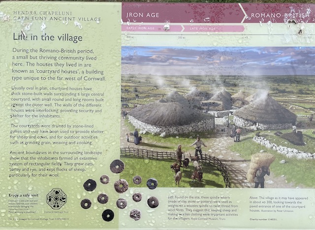 It was a good time to find the famous fogou (pronounced ‘foogoo’) that these westernmost Cornish settlements were famous for. This is an underground walkway and space found in a number of these Iron Age villages in Cornwall. There is no evidence of what their specific use was, but speculation ranges from a place of worship to food storage. We found both entrances simultaneously as Anne had wandered around the far side of the area. Needing to stoop again to get below the entrance lintel, it opened into a more accommodating passageway. And was dry, if you didn’t touch the green tinged stone walls. In the middle there was an opening into a circular underground room, and standing here, it felt eerie, knowing these spaces had been dug out and used, for whatever purpose, two thousand years ago. I was almost afraid to touch the wall in case I had an Outlander moment and got swept back in time. I think I’m too soft to survive that period. They wouldn’t have had Crazy Daisy crockery.