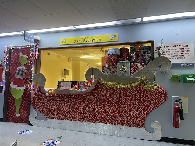 Our arrival was the consequence of a fall that Anne had had at our running club Christmas do the night before. She had smart but slippy flat shoes, and they … well … slipped her up on the wooden floor, after she was coming back from the loos. Luckily, amongst our runners, we have a few doctors, and one of them, Dave, made sure Anne was well enough for us to take home with the reminder that she should get it checked out the following day at the latest.