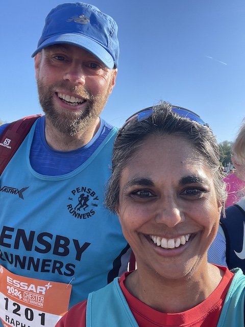 In Chester he found a handy carpark, only a half mile from the racecourse, the start of the Half. People had been walking down in their kit from quite far out, so I was glad not to have to do any more unnecessary exercise than that. On the grassy fields there were thousands of runners and their well-wishers, but we couldn’t see any other Pensby vests despite the fact that over twenty of us had signed up for it.