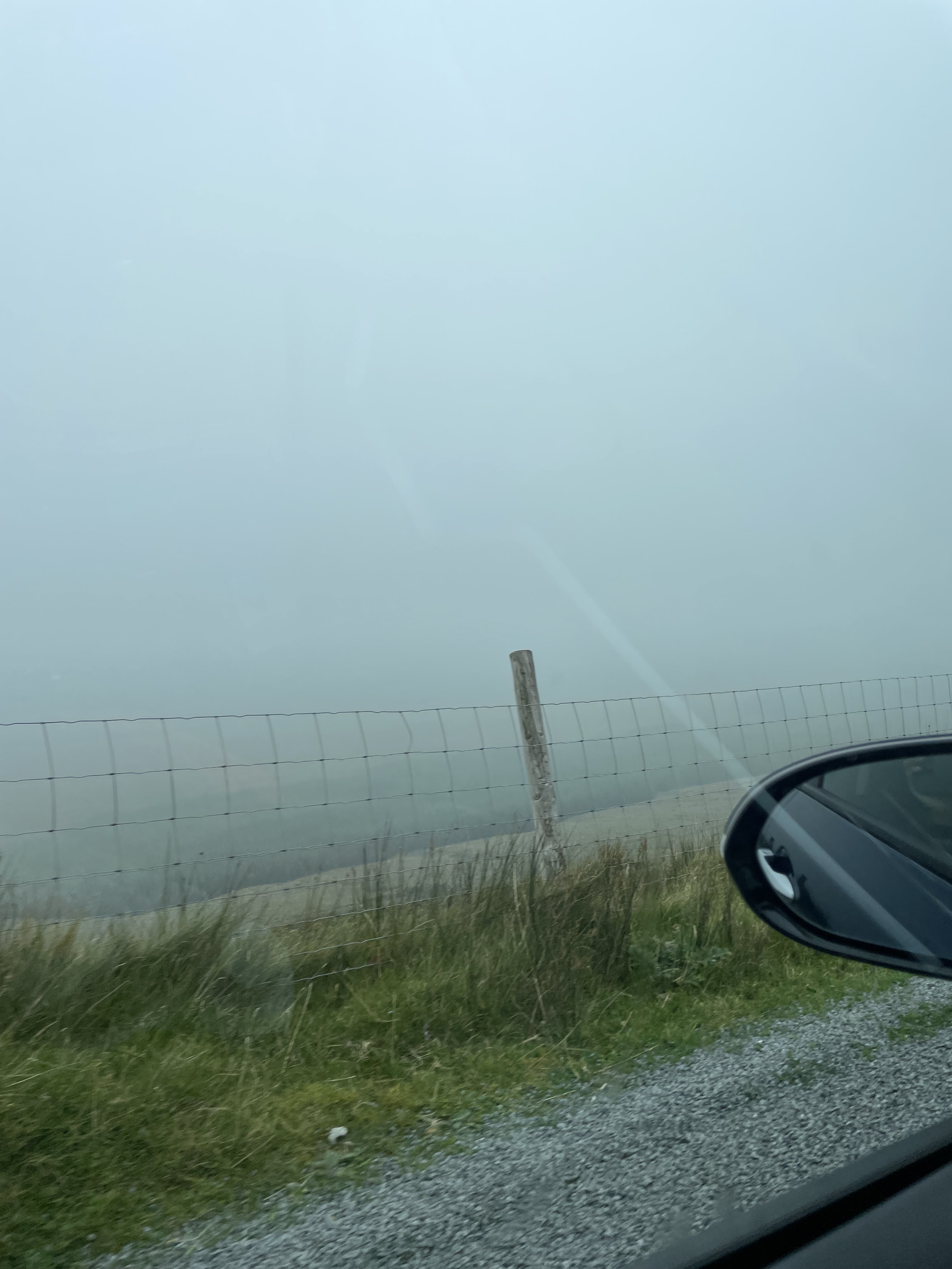 The first time I went to drive on Conor Pass from Cloghane to Dingle, I was trepidatious after those warnings. Because it is a mountain road, the views can either be precipitous or non-existent, as the clouds often come down around you. For me the clouds came, and it took me a few moments to find the rarely used fog-light controls. Not so much for my view, which reached barely five yards ahead whatever I did, but for oncoming traffic, that may want to know about a car coming on the windy single lane road at the top. Pin pricks of light were the first things I could see in the thick white mist, so I think it helped.