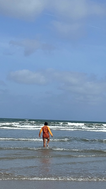 When we returned, I had every intention of getting in, at least to my waist. I slipped off my Teva sandals (very compact, great for packing) and ran in, and almost as quickly, ran out again. My sister Hersha joined me, and it was only up to the knees for her too, as her trousers couldn’t be pulled up much higher. I’m not a well-hard wild swimmer and that blast on the calves was enough for me. Anne had the best idea, though, relaxing in her bucket chair, drawing the scene, and absorbing the colours and salty air of this beautiful coastline.
