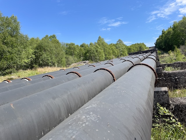 The final part was steep, stoney and winding, with the added frisson of dodging the motorbikes. It wasn’t all that easy to walk it so I tried jogging again, which was a tad better. Sally had a little go herself and did indeed find that it felt a bit easier than walking down, and kind of fun. In the final part coming into the town, we walked next to the long black pipes of one of Scotland’s many hydro-electric power stations. Kinlochleven was known as the ‘Electric Village’ because it was the first village in the world to have every house connected to electricity, in the nineteen tens.