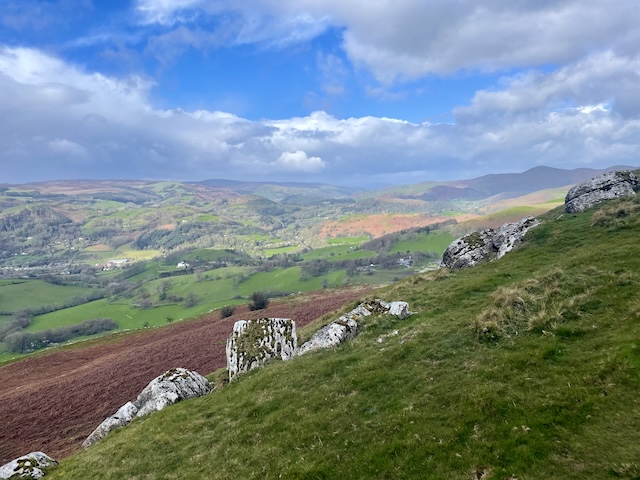 Apparently in previous years the Castell Dinas Brân had been bypassed, but this time, on a zig zaggy path that was equally steep to the gully albeit shorter, we trudged our way up to and through the ruins of the mediaeval fortress.